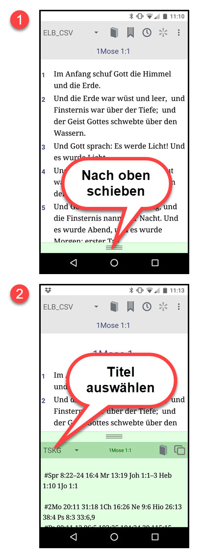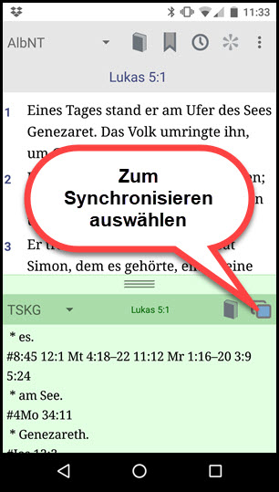 Wörterbücher, Kommentare und Bücher werden im zweiten Bildschirm angezeigt. Sie können sie erreichen, indem Sie auf die drei Striche in der grünen Leiste am unteren Bildschirmrand klicken (oder sie nach oben schieben).