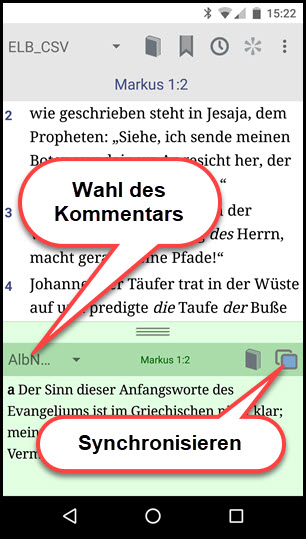 Sie können aber auch auf beide Quadrate in diesem grünen Balken auf der rechten Seite klicken. Dann wird der Kommentar mit dem Bibeltext im oberen Bildschirm synchronisiert (1 Feld wird blau).
