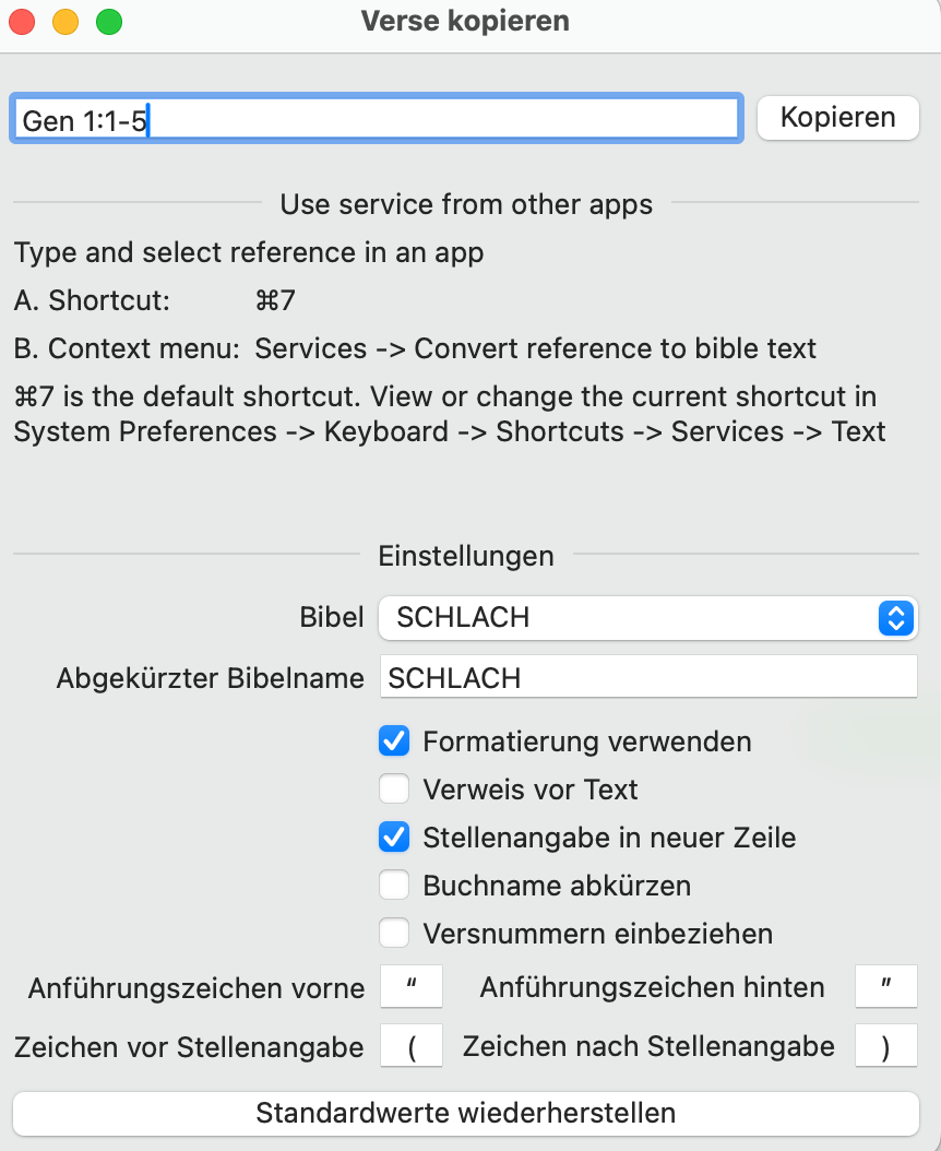 Geben Sie einfach z.B. Gen 1:1-5 in das Textverarbeitungsprogramm ein und markieren Sie dann Gen 1:1-5 mit der linken Maustaste. Dann fügen Sie den Text ein, indem Sie ⌘ und 7 gleichzeitig drücken.
