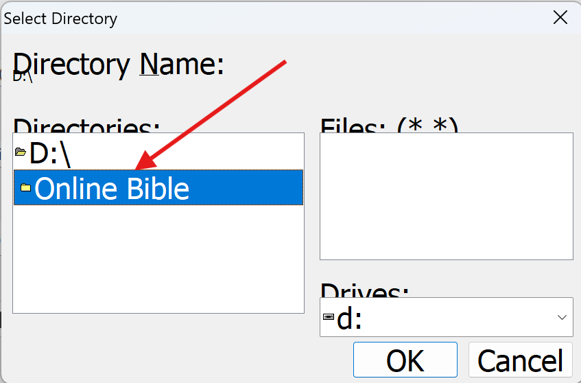 In this example, it's the Online Bible folder on drive D. Select that folder, and then click OK.
