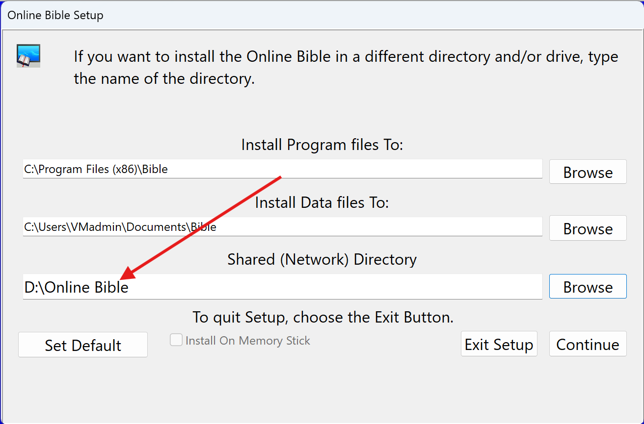 During the installation, there are 2 options for the location of the Online Bible.