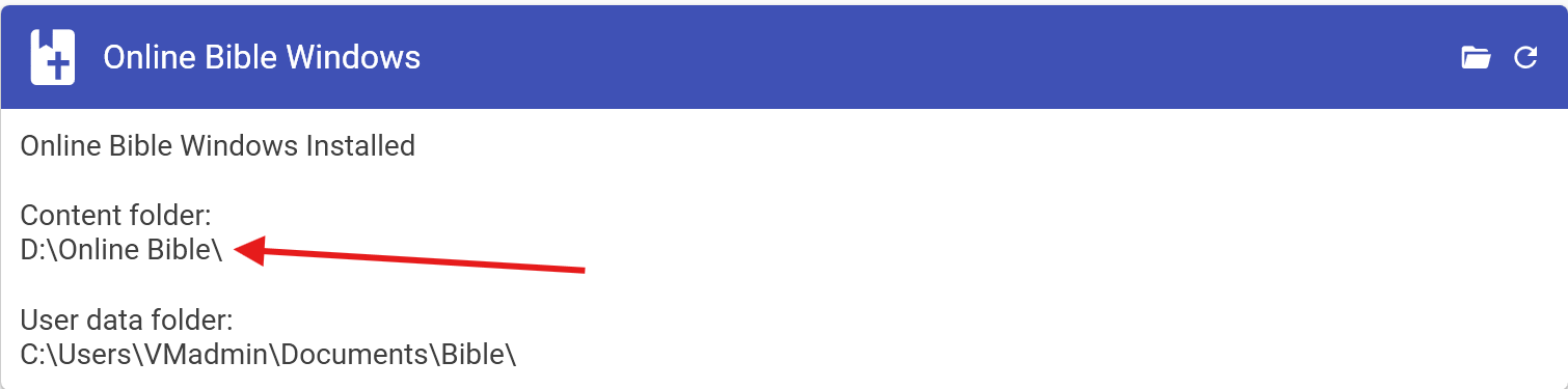 If the correct locations are not listed here, click on the folder icon in the top right corner of the blue bar with Online Bible Windows, after which the explorer opens.