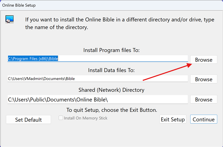 During the installation of the Online Bible, the following screen appears, in which the 3 locations can be seen and can be adjusted.