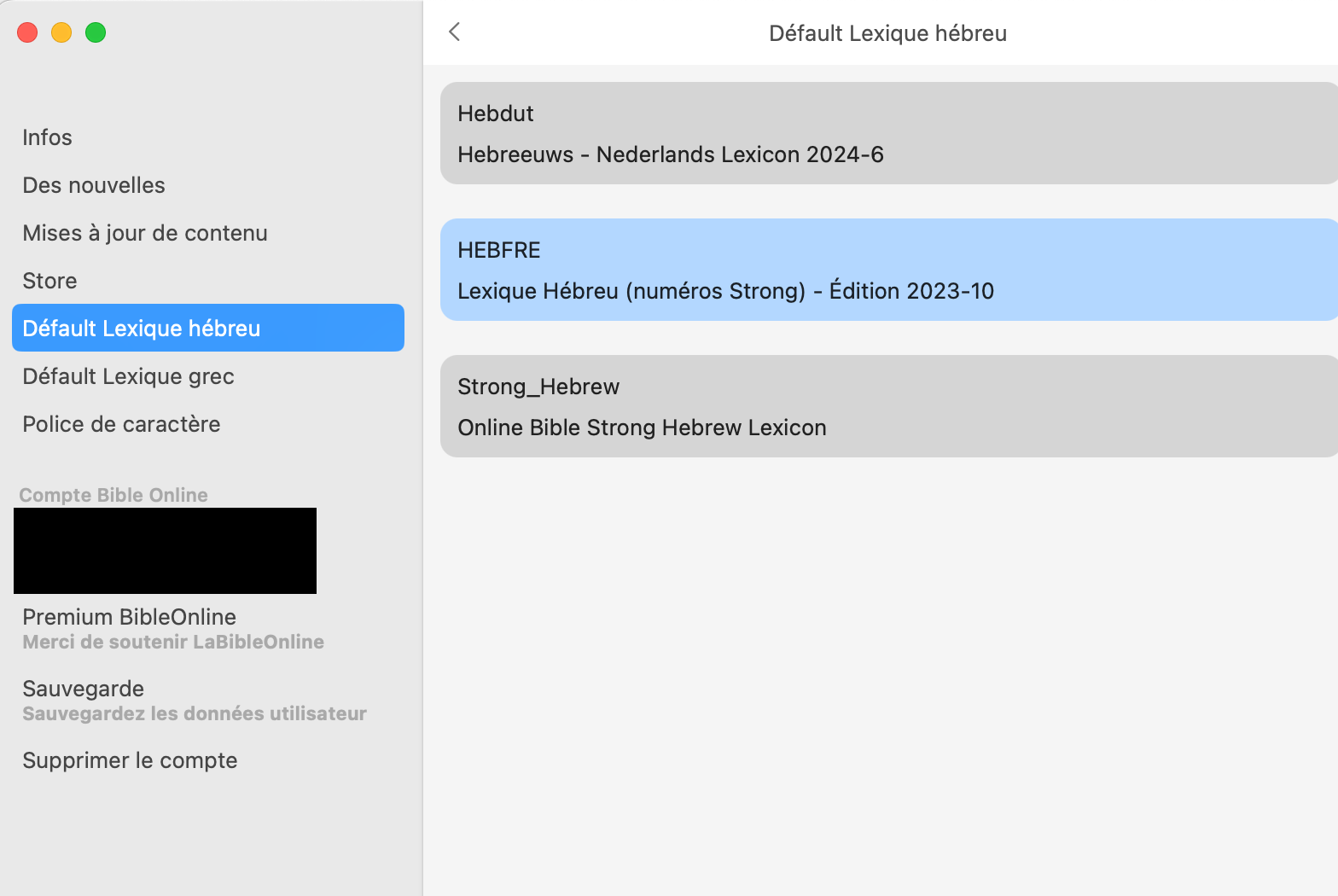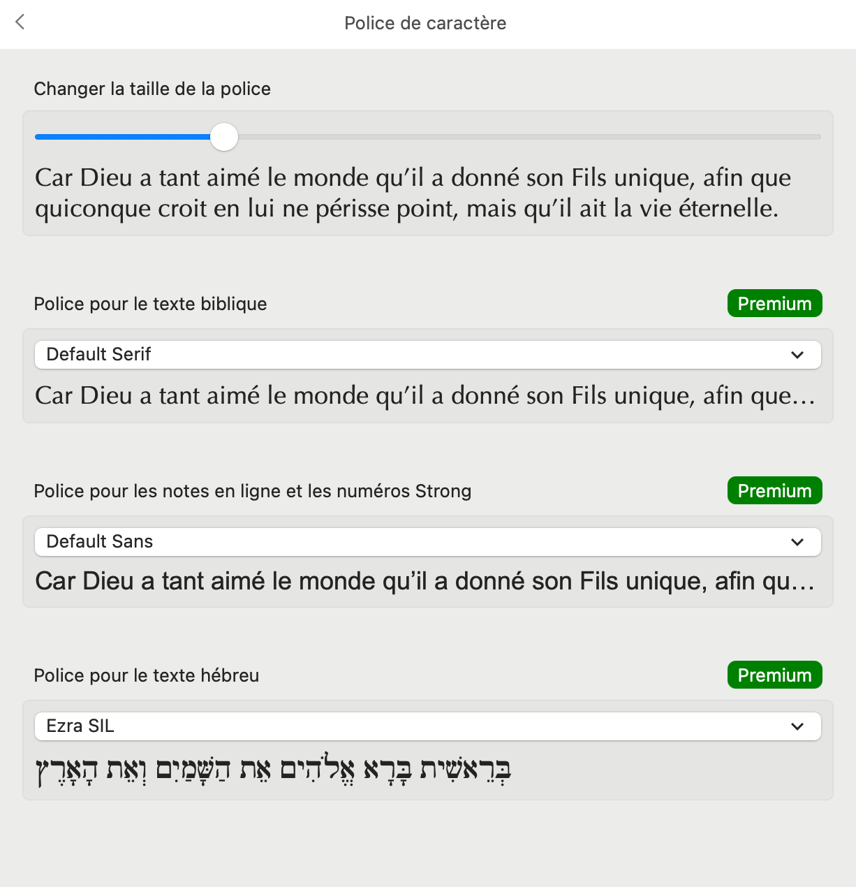 Sous Online Bible -> Réglages vous trouverez, entre autres, les Mises à jour du contenu, la Store et vous pouvez définir les lexiques par défaut pour le grec et l'hébreu. Vous pouvez également personnaliser la police de caractères. Cette dernière fonction est toutefois une fonction Premium :