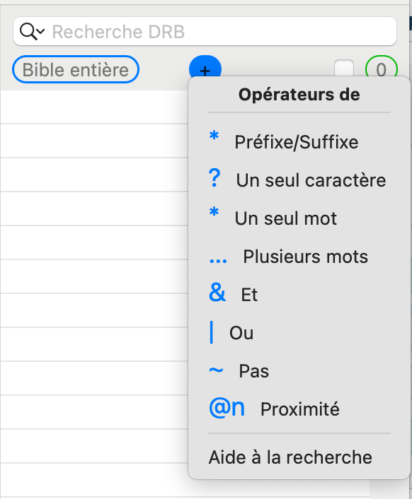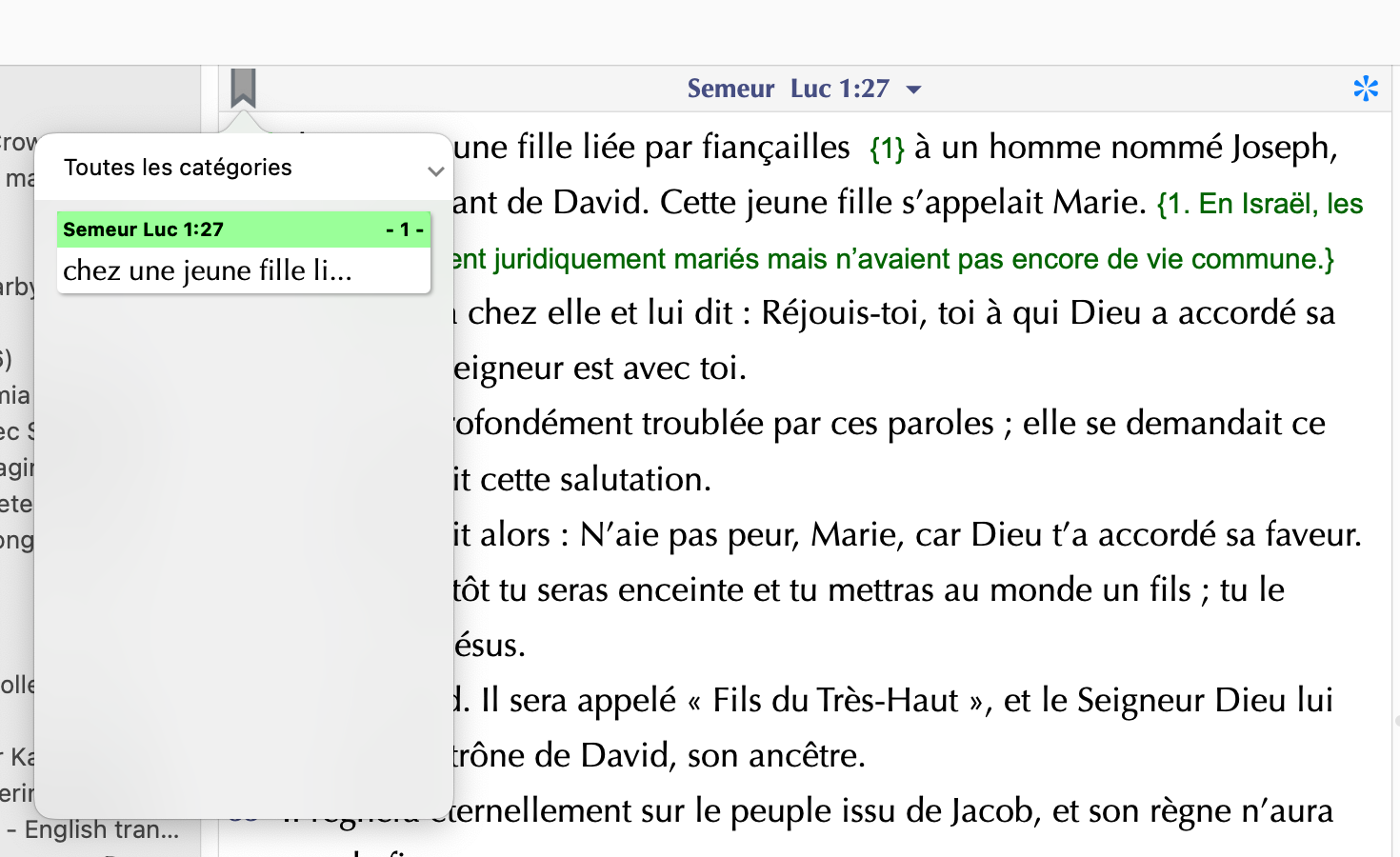 Selon la traduction biblique choisie, 2 caractères peuvent être affichés en haut à droite de la fenêtre: