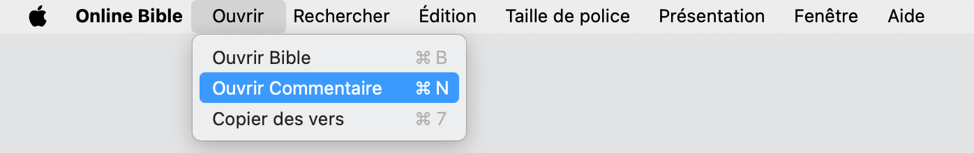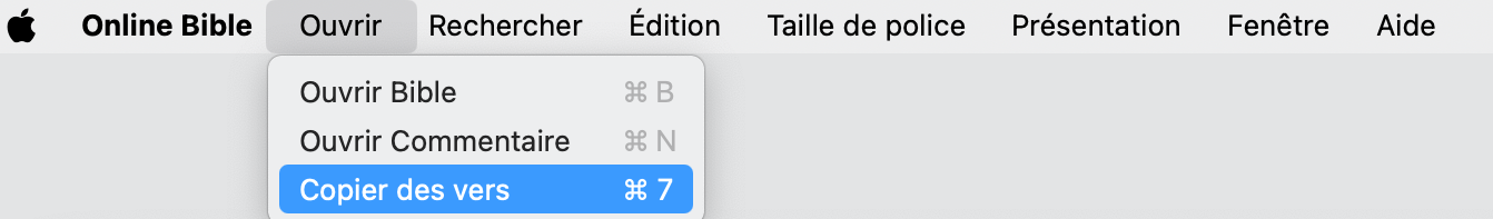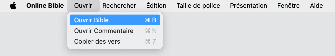 Vous pouvez également choisir dans le menu : Ouvrir -> Ouvrir Bible (ou la combinaison de touches ⌘ B) :