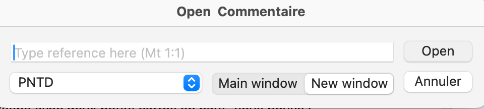 Vous pouvez ouvrir un texte biblique et une traduction ici. Vous pouvez également choisir d'ouvrir le texte biblique dans une nouvelle fenêtre (New window) ou dans la fenêtre principale (Main window):