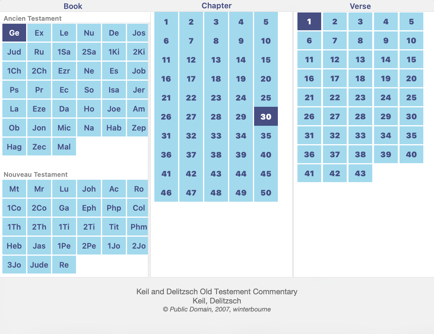 Vous pouvez ouvrir un commentaire ici. Pour ce faire, sélectionnez une section de la Bible (p. ex. Gen 1) et le commentaire que vous souhaitez ouvrir (p. ex. Keil and Delitzsch).
