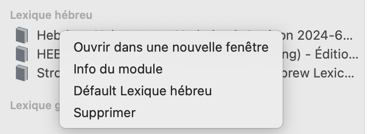 Si vous cliquez ensuite sur un nombre fort, un lexique s'ouvrira. Pour plus d'informations, voir le point 3 ci-dessus. Si vous disposez de plusieurs lexiques, vous pouvez en désigner un (par langue grecque/hébreu) comme le lexique par défaut (celui qui s'ouvre automatiquement lorsque vous recherchez un numéros Strong). Pour ce faire, allez dans le panneau de gauche où tous les titres installés sont listés, sélectionnez un lexique, et avec un second clic choisissez l'option « Default Lexique...» :