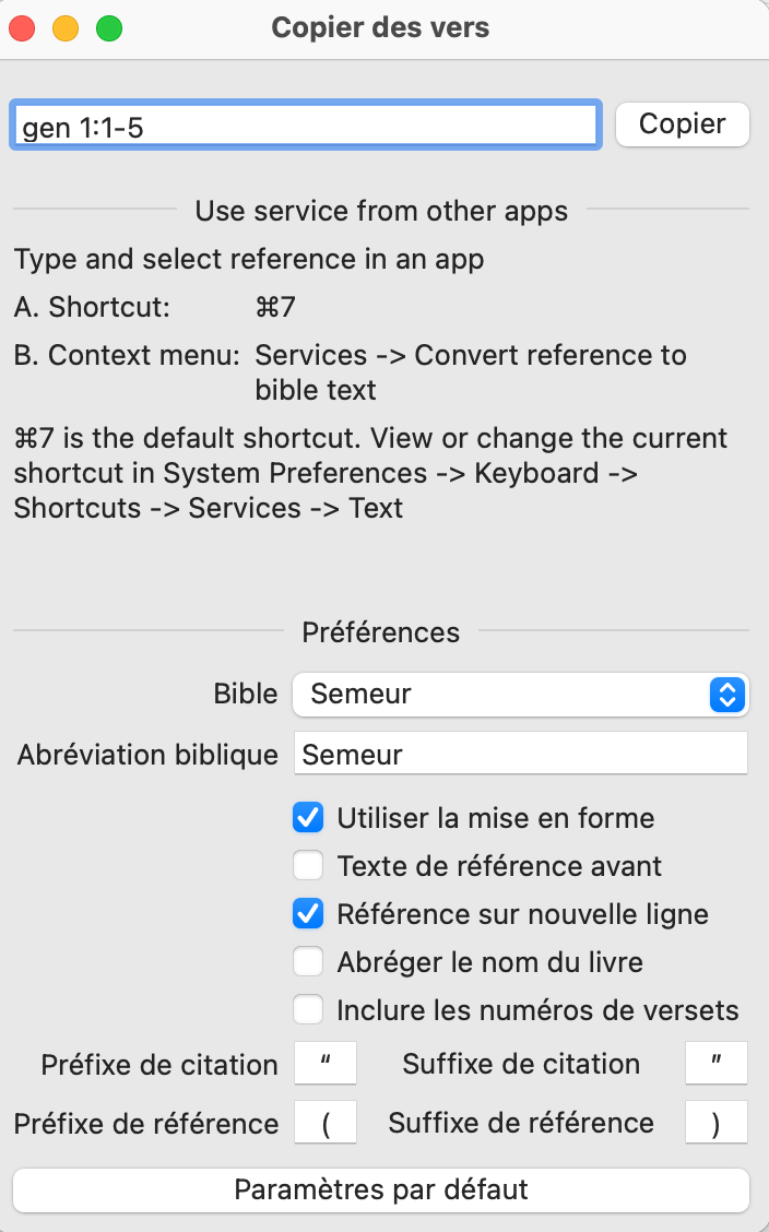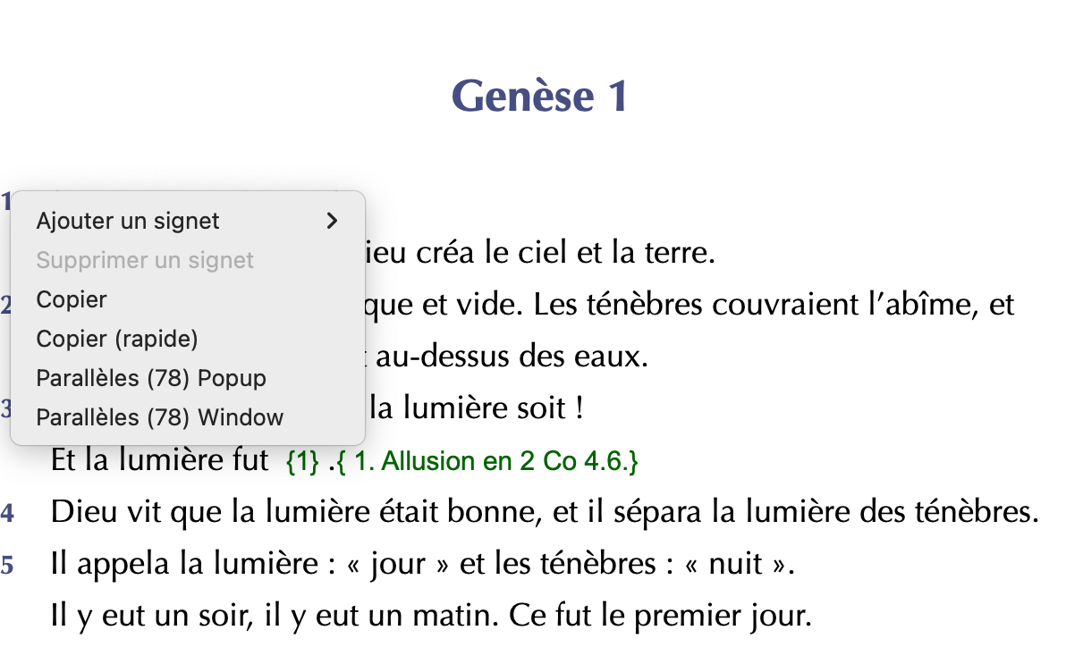 Il suffit de taper, par exemple, Gen 1:1-5 dans le traitement de texte et de sélectionner Gen 1:1-5 avec le bouton gauche de la souris. Collez ensuite le texte en appuyant simultanément sur les touches ⌘ et 7.