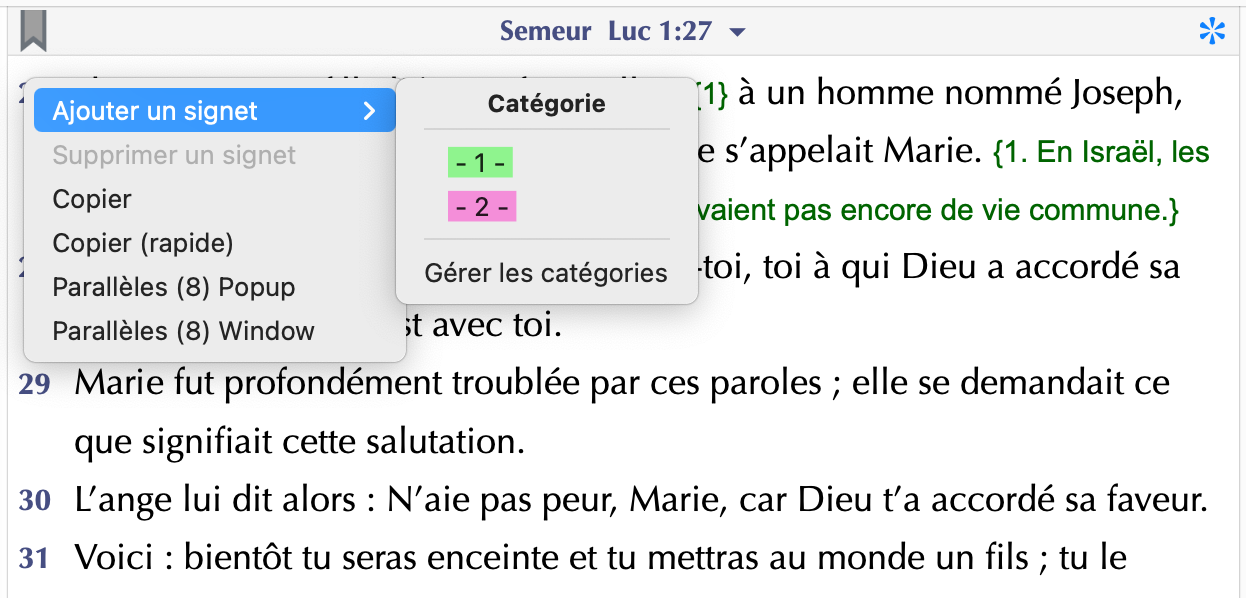 Dans le texte de la Bible, cliquez sur le numéro du verset. Dans la fenêtre qui s'ouvre, choisissez ajouter un signet :