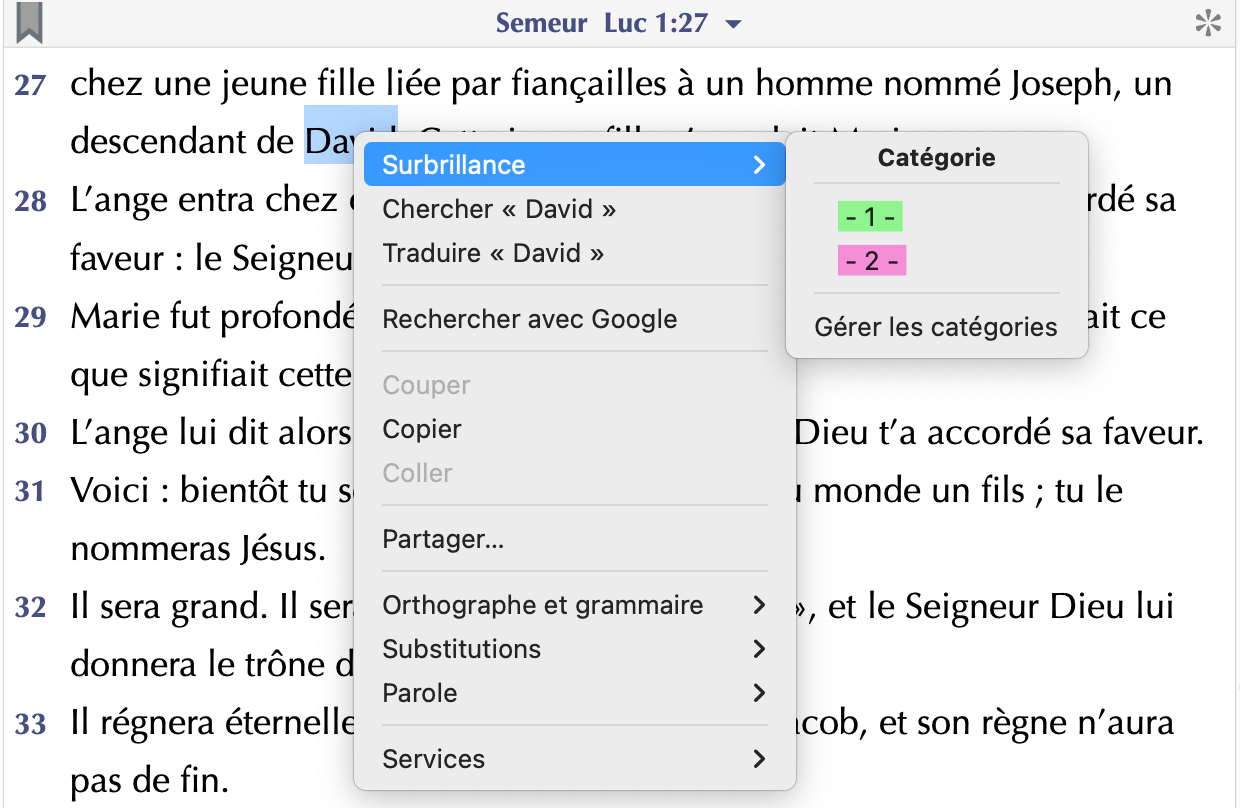 Si vous souhaitez mettre en évidence un ou plusieurs versets, sélectionnez-les d'abord avec le bouton gauche de la souris, puis mettez-les en évidence avec le bouton droit de la souris.