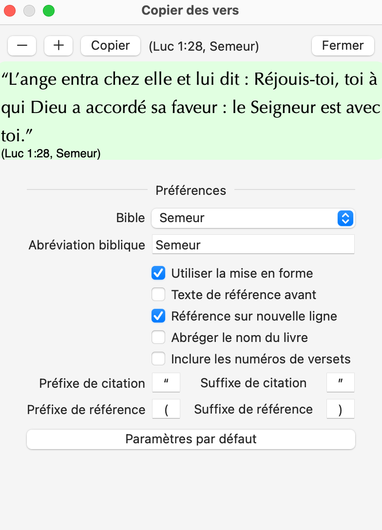 En outre, vous pouvez sélectionner une traduction de la Bible, ainsi que choisir un formatage particulier. Par exemple, si le texte doit être entre guillemets. Vous pouvez ajuster les guillemets comme vous le souhaitez.