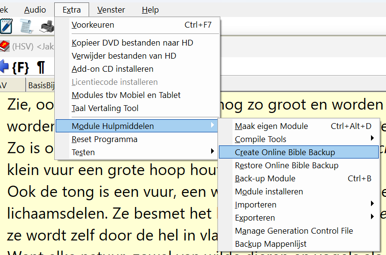 De functie voor het maken van een backup heet Create Online Bible Backup en is te vinden in het menu Extra, en daarin het submenu Module Hulpmiddelen.