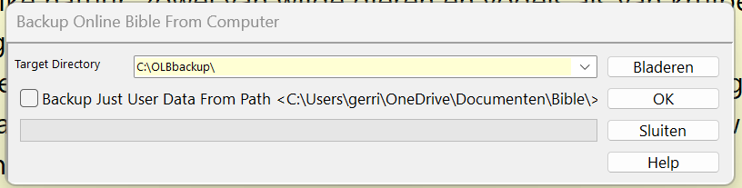 Zorg dat, voordat de backup wordt gemaakt, de map waar de backup geplaatst moet worden al bestaat, want in de Online Bijbel backup functie kunt u geen mappen aanmaken. In het voorbeeld wordt de map c:\OLBbackup gebruikt.
